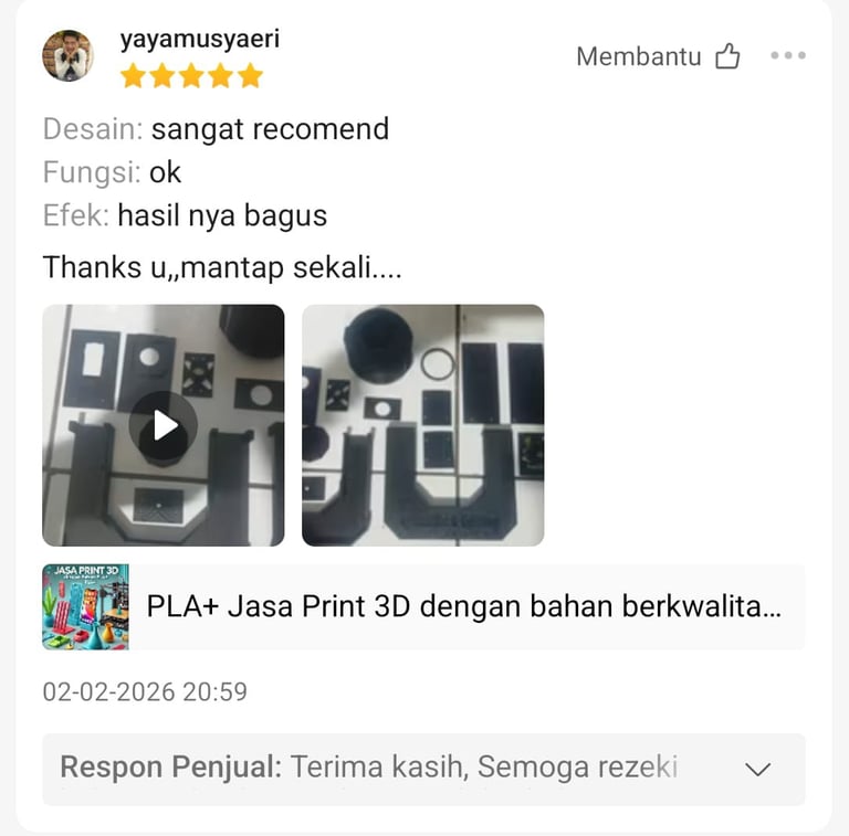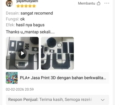Kami menggunakan material berkualitas seperti PLA+2, TPU (Karet), Petg, ABS, Nylon, dan material lain sesuai kebutuhan proyek.